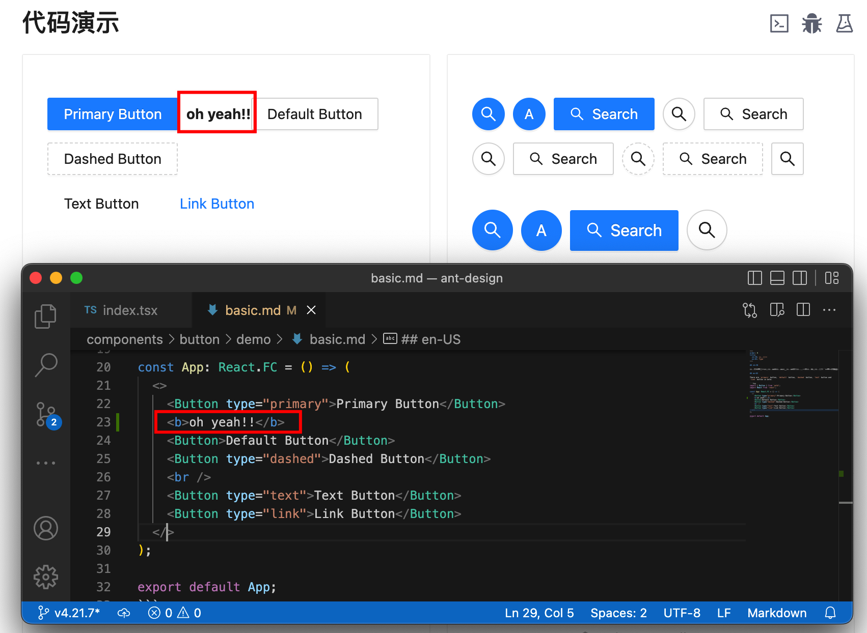 用VScode搜索Primary Button字段,尝试修改components/button/demo/basic.md
