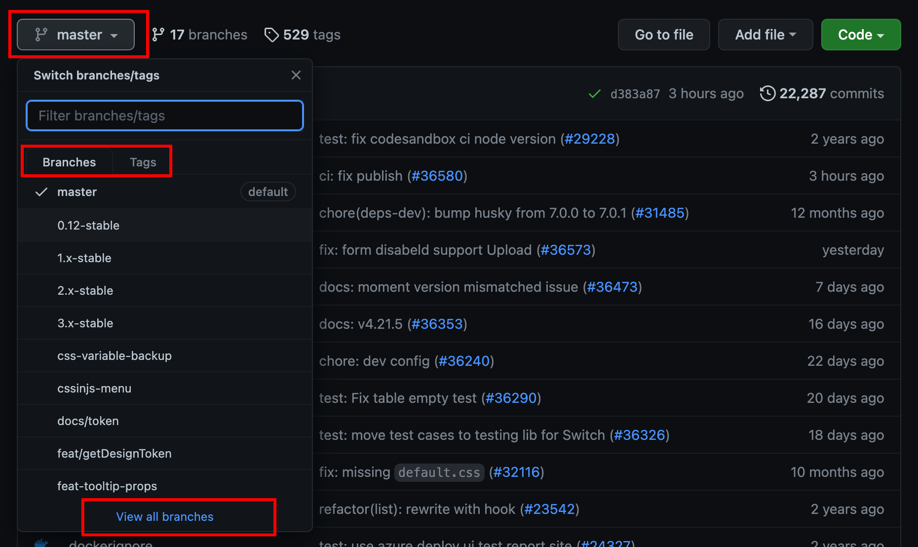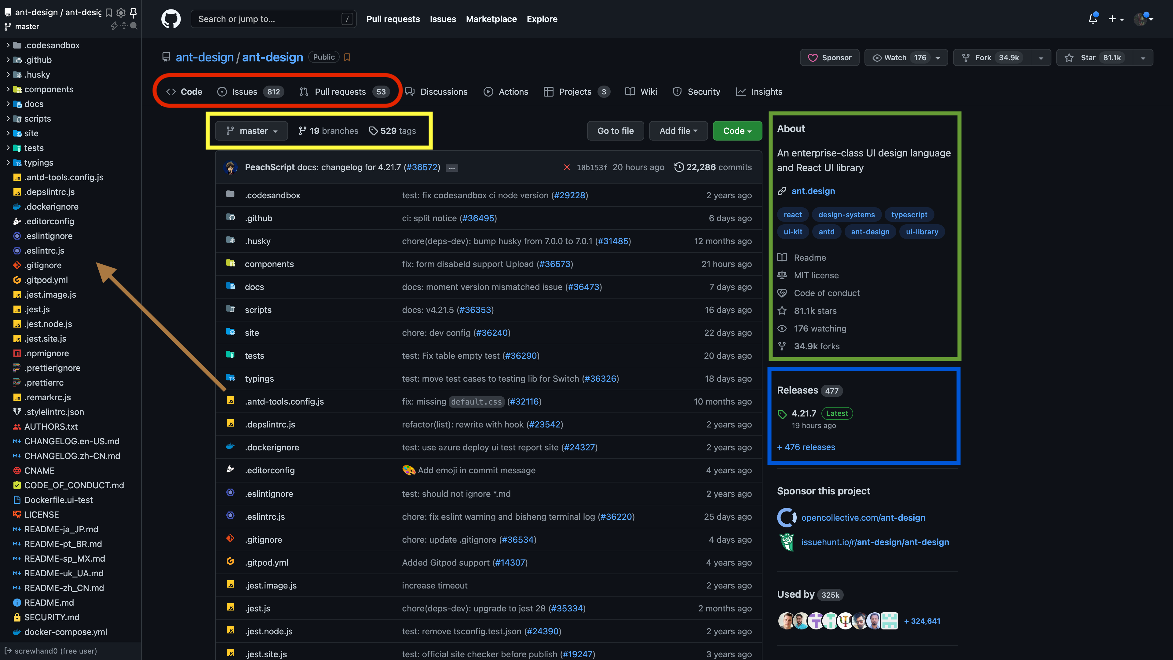 - 黄色:master是当前的分支,分支信息(目前有19个分支),标签信息(529个);