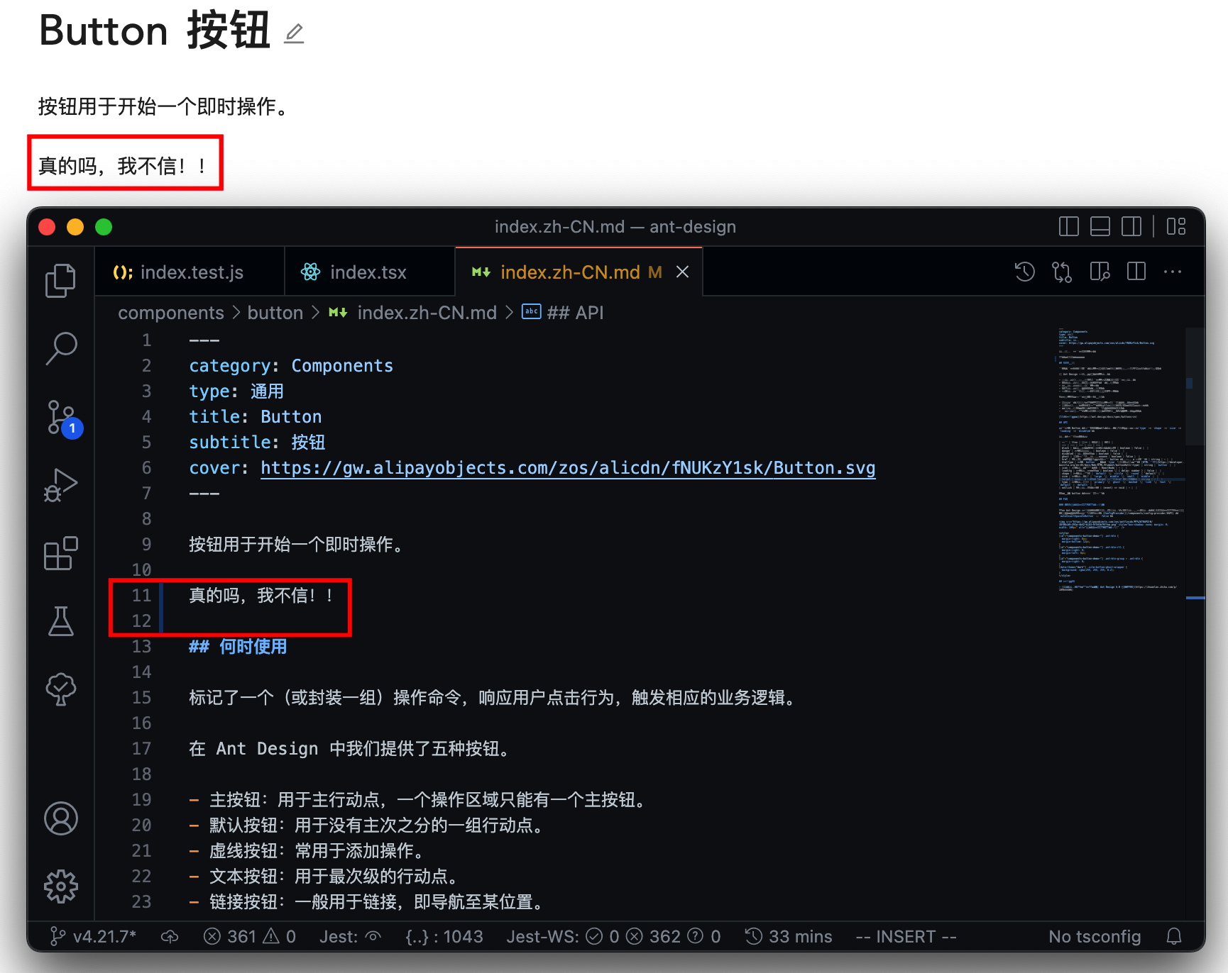 components/button/index.zh-CN.md ,试着修改这段文本,在本地的官网项目查看效果。