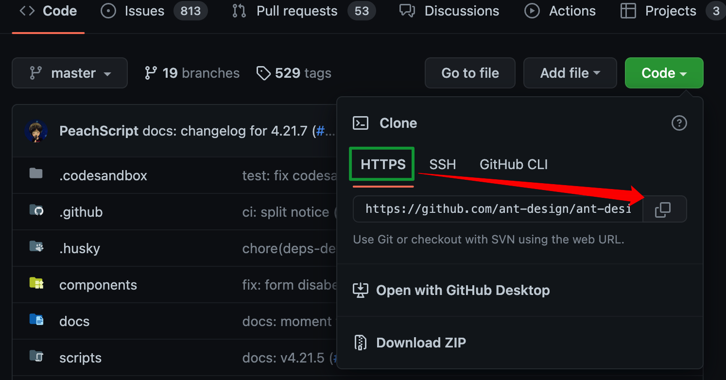 现在我们要clone源码,点击上图的绿色按钮“Code”,有三种方式Clone代码,最通用的是使用HTTPS方式,红色箭头点击可直接复制url。