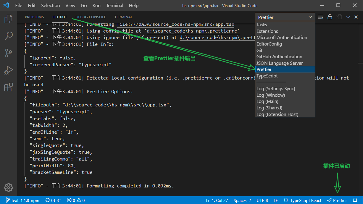 格式化代码:使用编辑器命令(F1 / Ctrl + Shift + p),输入Format Document或者使用快捷键(Alt + Shift + F)。安装完插件后第一次格式化,编辑器会因为有多种格式化方案(编辑器内置、prettier 共两种)而让用户配置默认的方案。需要选择prettier。代码正确格式化时,会在上图的OUTPUT > Prettier 打印日志。